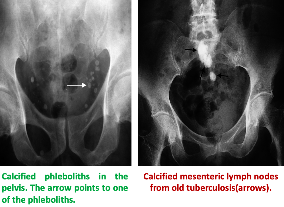 caused by old tuberculosis. They are irregular in outline and very dense (Popcorn), and because they lie in the mesentery they are often mobile.