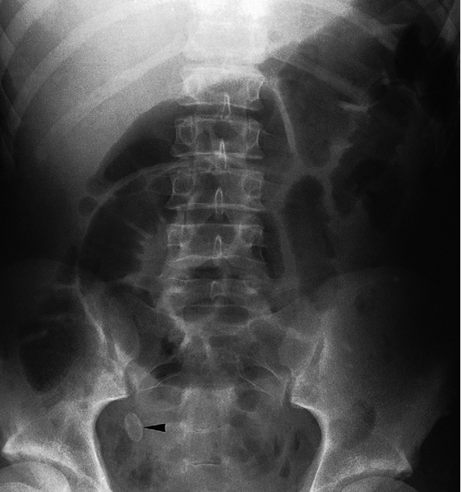 Calcified faecoliths may be seen in diverticula of the colon or in the appendix. The presence of an appendicolith is a strong indication that the patient has acute appendicitis Appendicolith The oval calcified shadow (arrowhead) is a faecolith in the appendix. Note the dilated loops of small bowel in the centre of the abdomen due to peritonitis – the so-called sentinel loops.