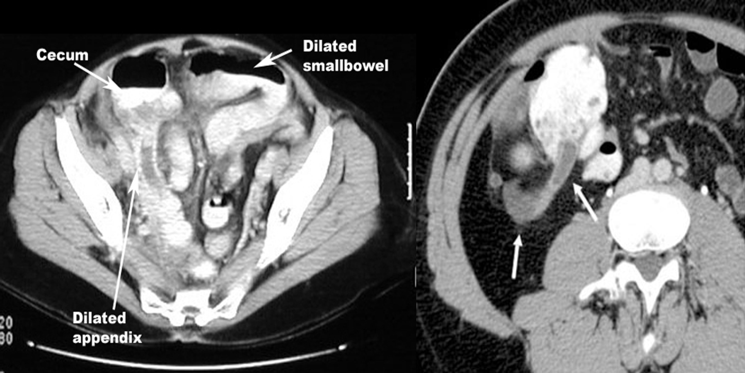 Gas in a right subphrenic abscess. There are several collections of gas within the abscess. The largest of these contains a fluid level (arrowheads). The air–fluid level under the left hemidiaphragm is normal. It is in the stomach.