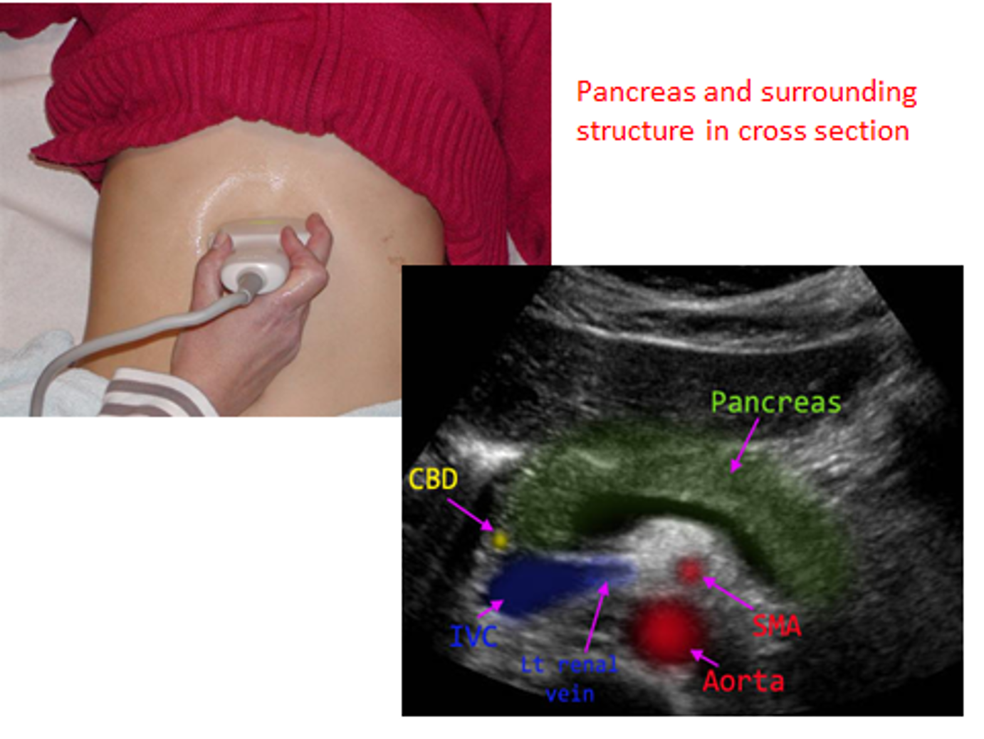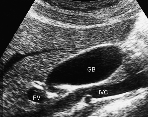The common bile duct is seen as a small, tubular structure lying anterior to the portal vein in the porta hepatis and should not measure more than 7 mm in diameter unless the patient has had a cholecystectomy, when it may be larger.
