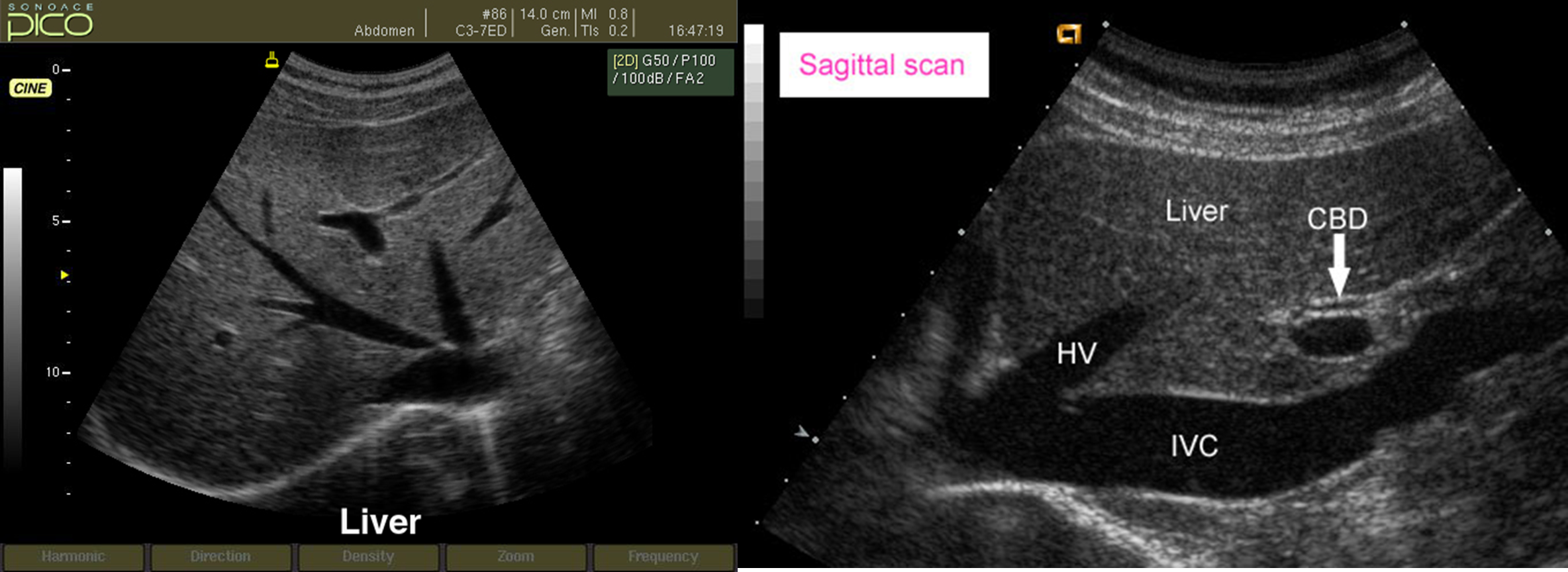 The normal hepatic parenchyma is of uniform echogenicity, composed of medium and low level echoes, interspersed with the bright echoes of the portal triads and echo-free areas corresponding to large hepatic veins.