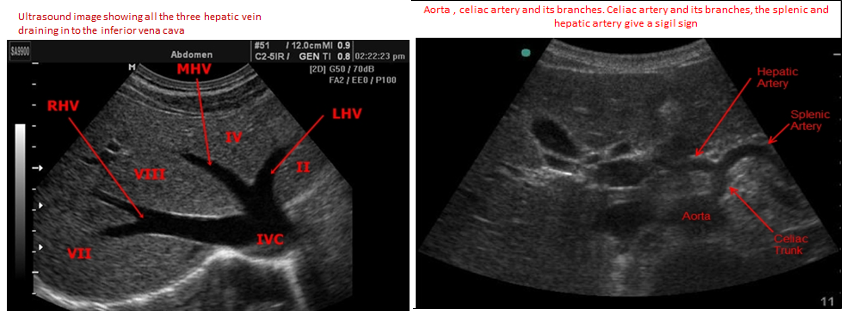 Transverse image at the dome of the liver shows left and middle hepatic vein draining into the inferior vena cava. The homogeneous liver texture is well seen