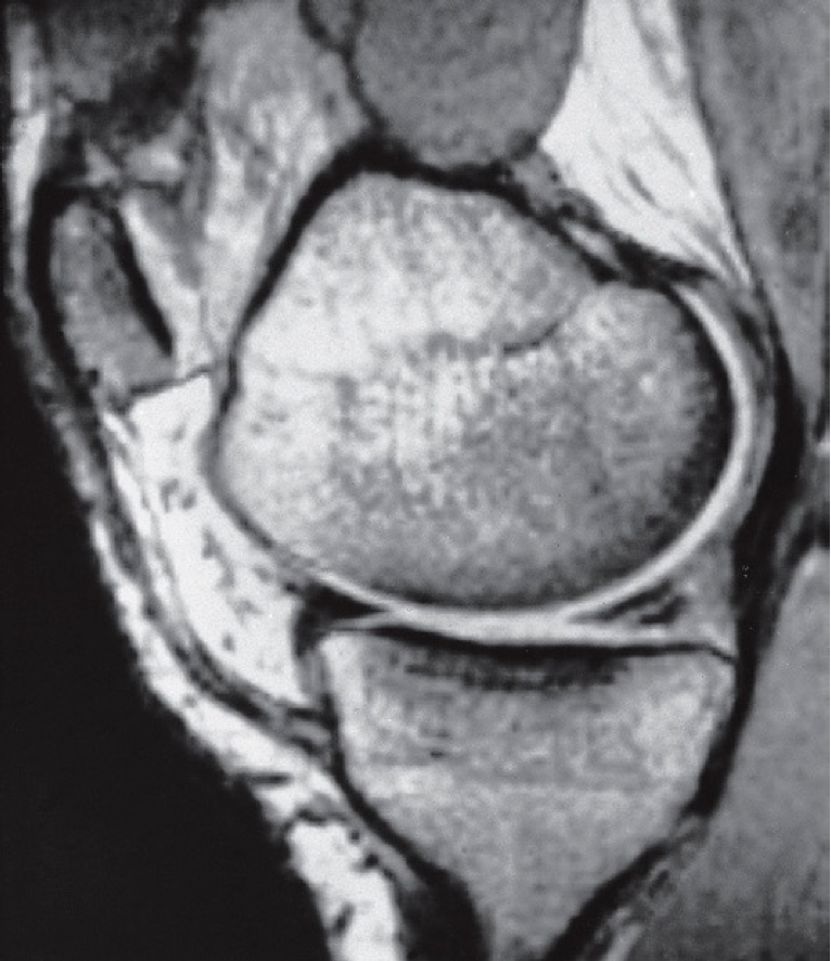 Tear of the medial meniscus. Sagittal MRI through the medial part of the knee joint showing a tear in the posterior horn of the medial meniscus. The anterior horn appears normal.