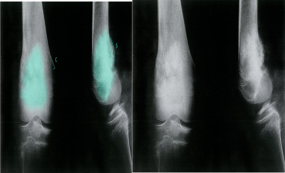 - X-ray right knee (AP and lateral views) of a patient with osteosarcoma