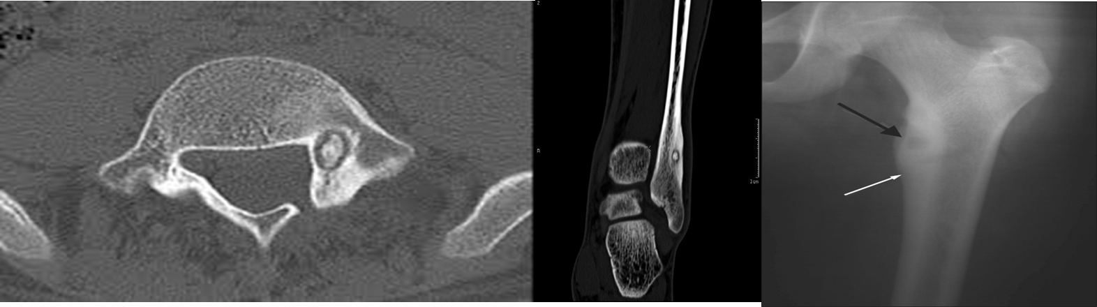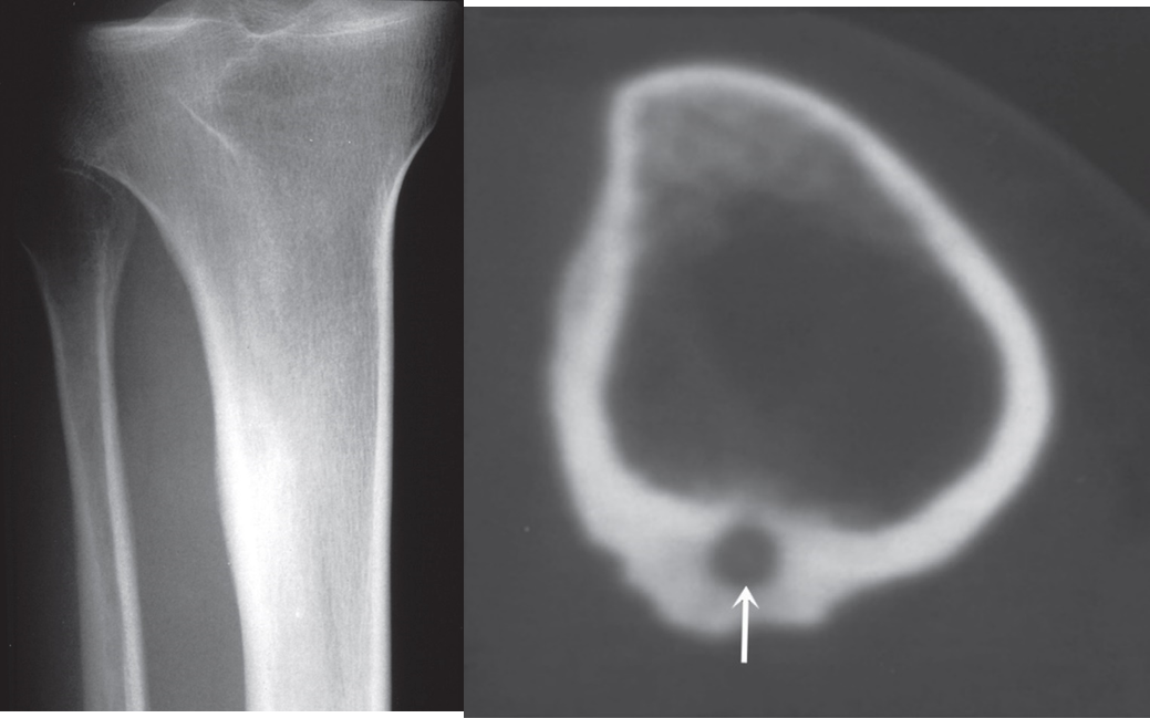 (b) CT scan showing sclerosis with a central lucency known as a nidus (arrow).