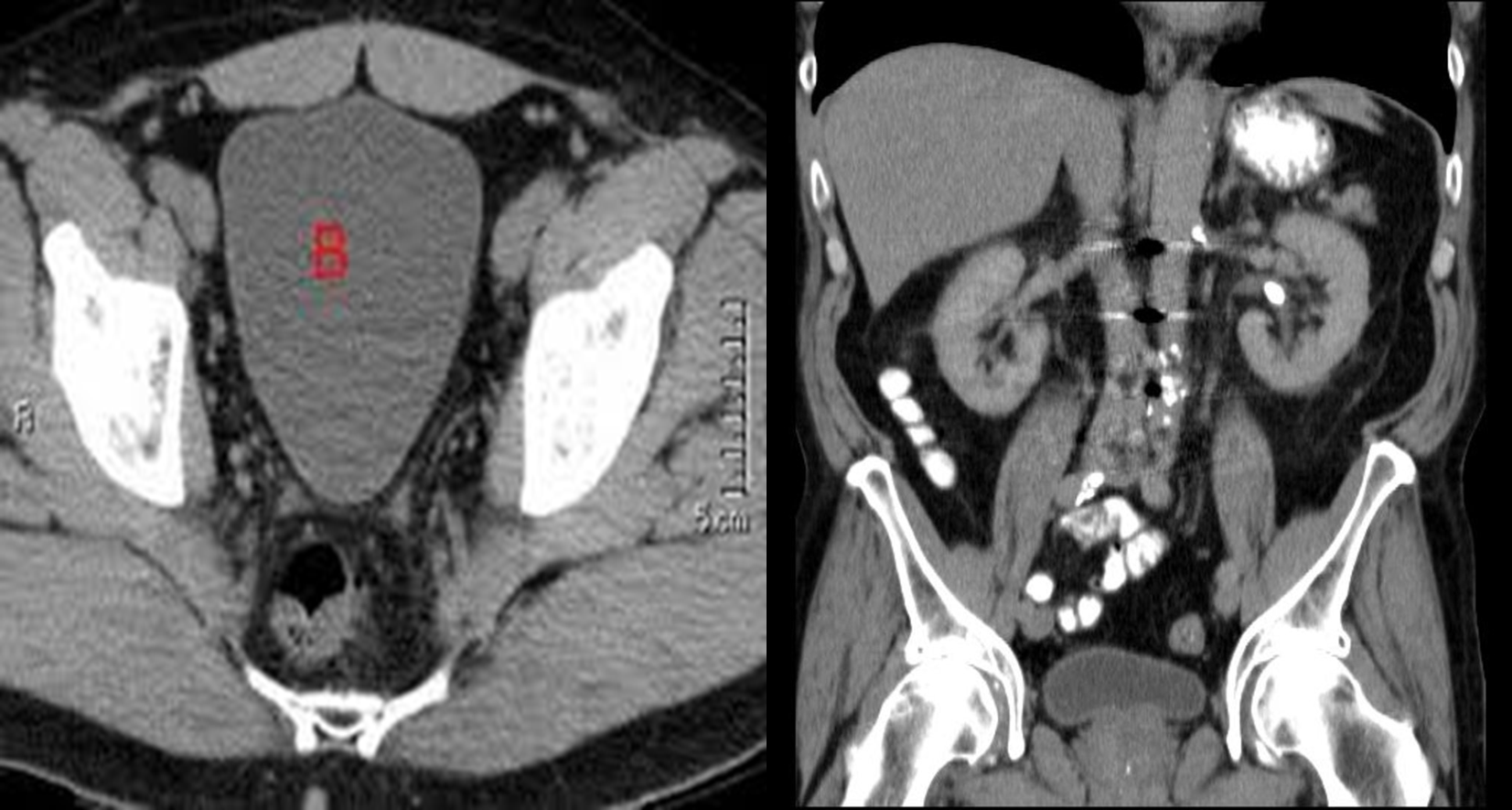 (d) ten minutes after contrast has been given. shows Section through the pelvis showing the ureters (arrows)