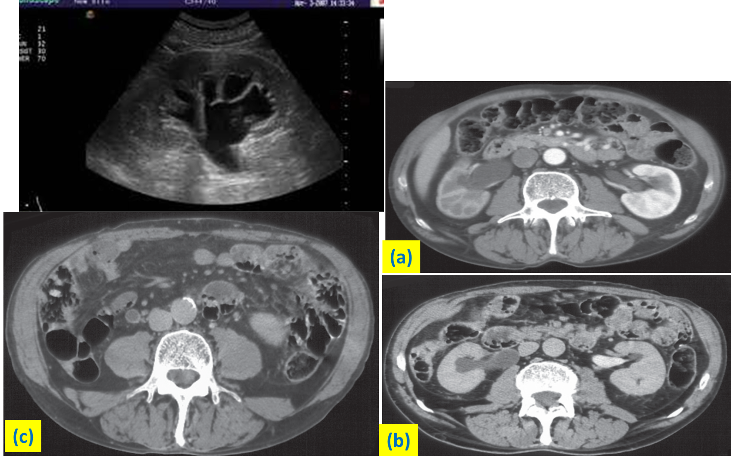 (a) CT at the corticomedullary phase of enhancement. There is obstruction of the right kidney with dilatation of the pelvicaliceal system (b) CT at the delayed phase of enhancement. Intravenous contrast is seen in the left renal pelvis but not in the obstructed right renal pelvis. (c) CT through the dilated right ureter , in the same patient as (a) and (b).