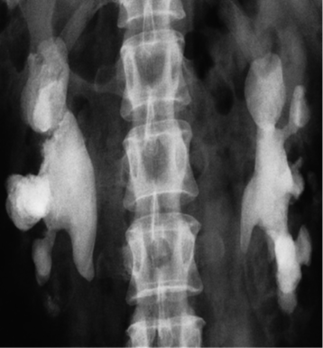 (a) IVU control film. Renal stones are not visible on the right and are very poorly visualized on the left. (b) IVU following intravenous contrast. Filling defects are seen in the right lower calix and pelvis and in the left upper pole calices . (c, d) CT of the kidneys in the same patient with no contrast medium, reformatted in the coronal plane, demonstrating the renal stones in both the right (c) and left (d) kidneys.