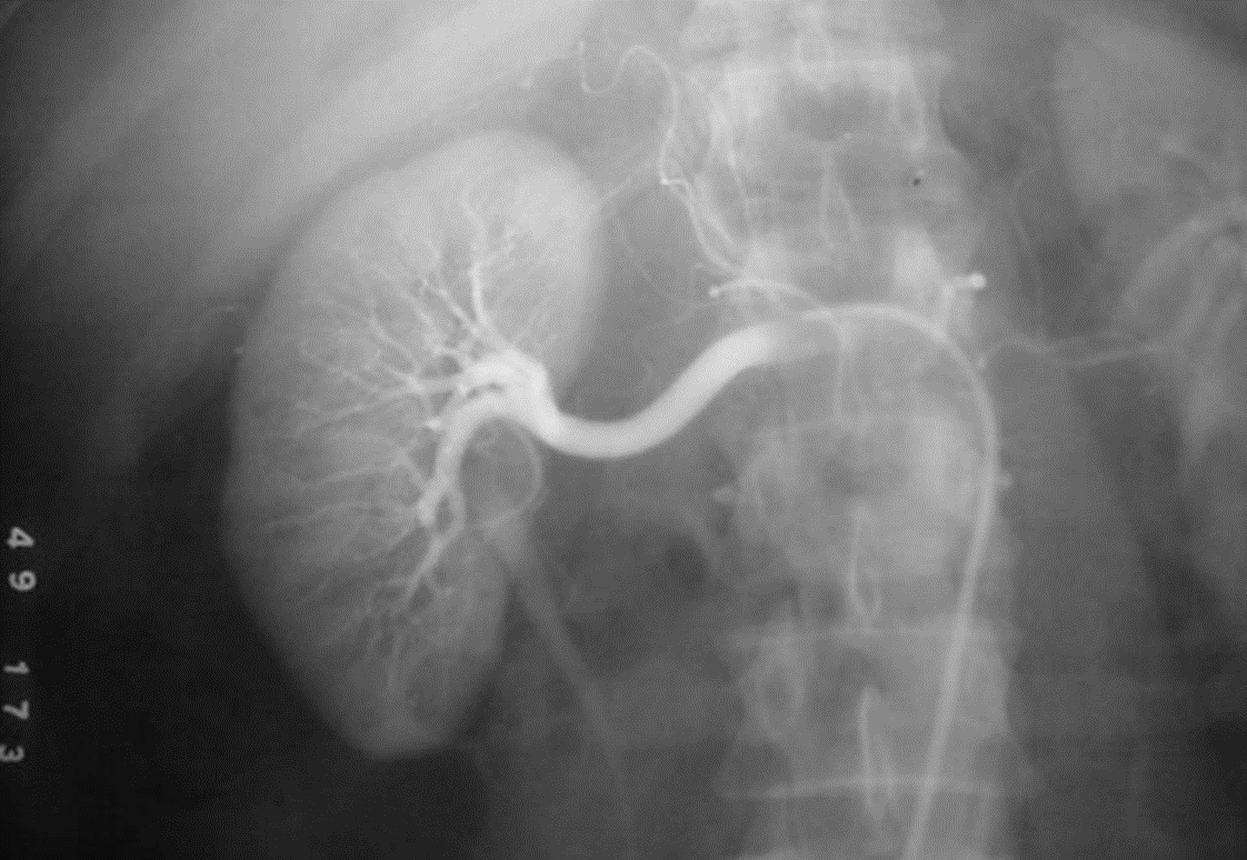 Renal arteriography is performed via a catheter introduced into the femoral artery by the Seldinger technique.