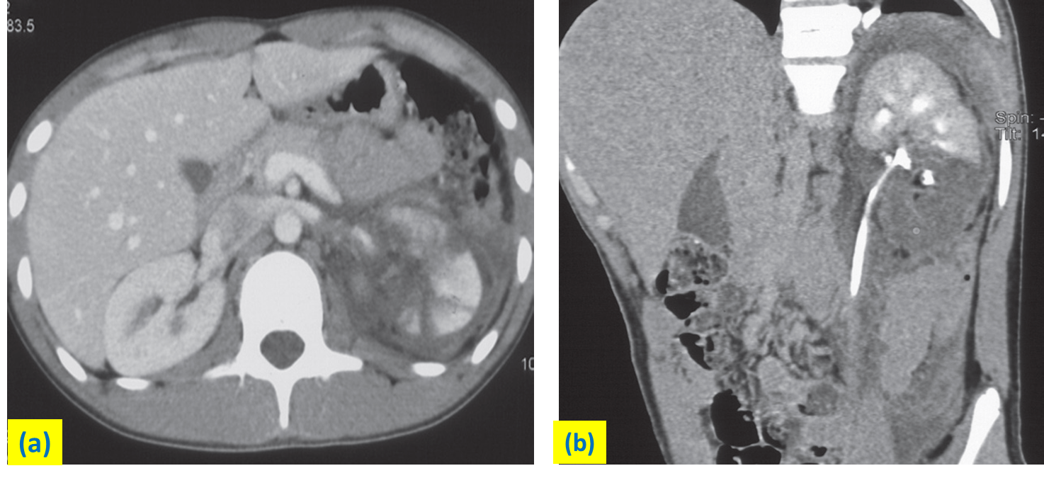 (a) Axial CT demonstrating reduced perfusion in the midpole of the left kidney. Fluid is seen in the perinephric tissues.