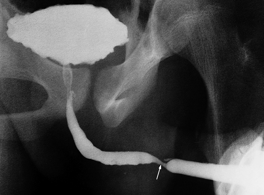 Urethral stricture. An ascending urethrogram showing a stricture in the penile urethra (arrow). The patient had gonorrhoea.