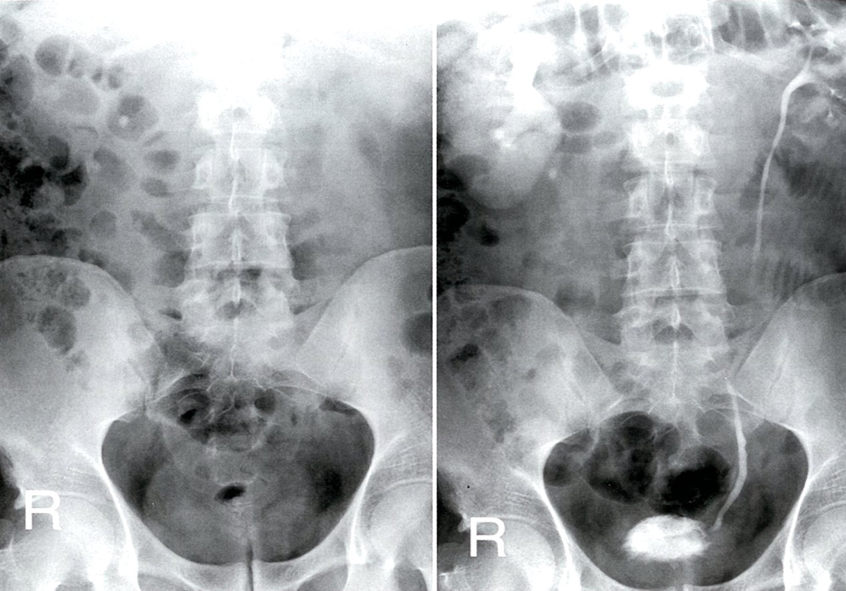 Excretory urography (AP view; left: pre-contrast; right: 2.5 hours post-contrast)