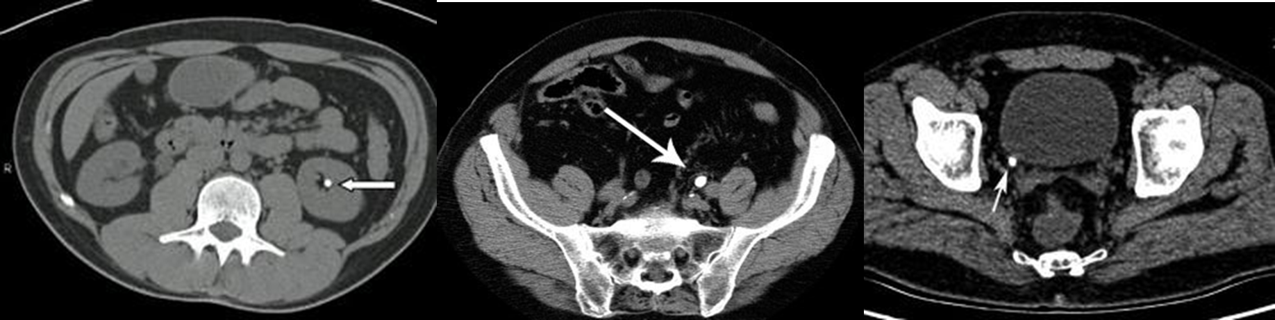 Hyperdense calculi located in the proximal third of the left ureter. As a result, the proximal ureter and the renal pelvis are dilated.