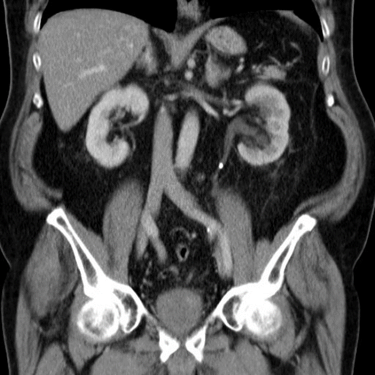 Abdominal CT with IV contrast (venous phase), coronal section