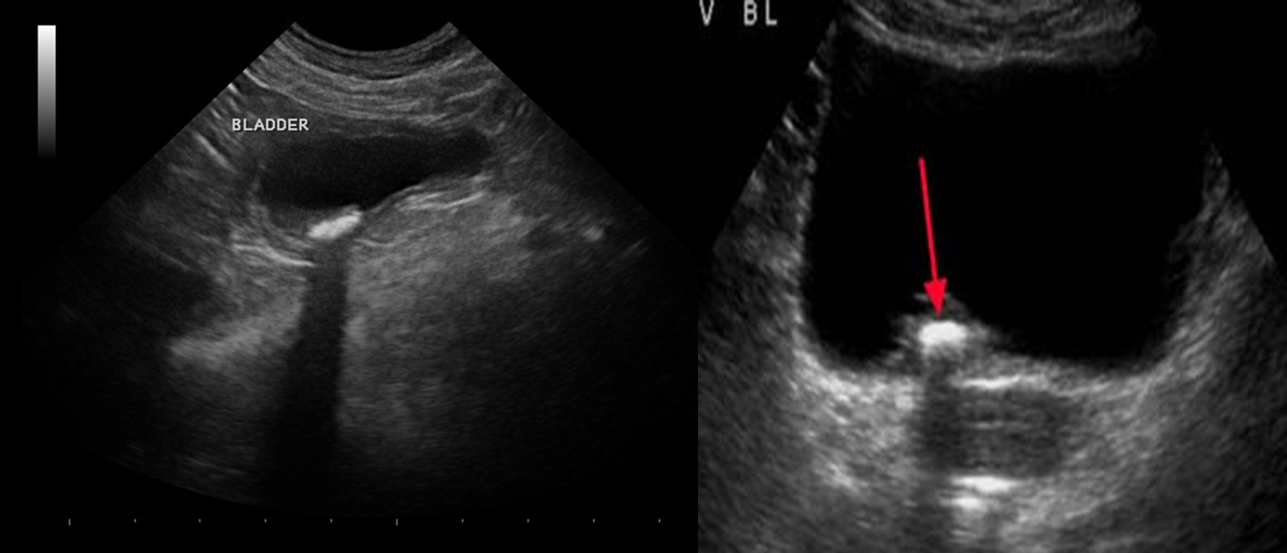 - Stone: hyperechoic with acoustic shadowing