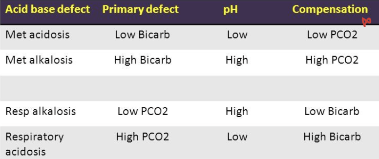 - Metabolic Diseases and selected drug overdoses: at risk of acid-base abnormalities, acid base problems are diagnosed through interpretation of arterial pH, PCO2 & HCO3 levels