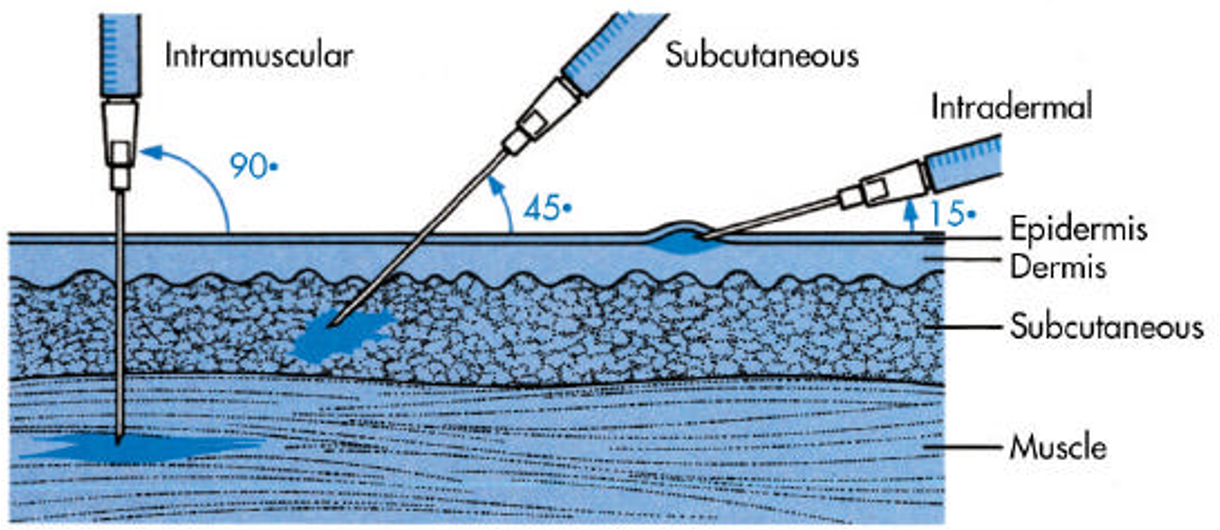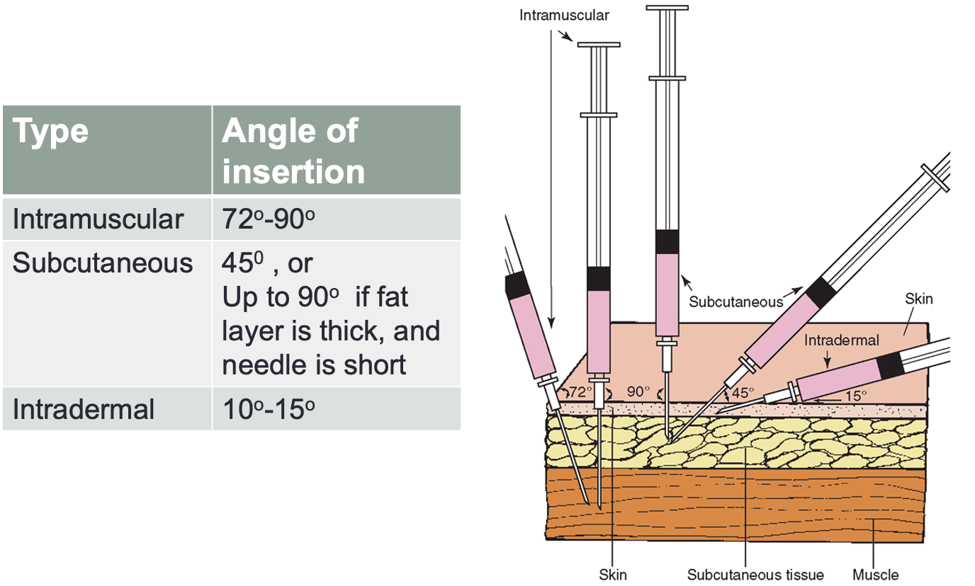 A) Intramuscular injection B) Subcutaneous Injection C) Intradermal Injection Intramuscular: many medications Subcutaneous: mainly Insulin Intradermal: test sensitivity and antibody formation Angles
