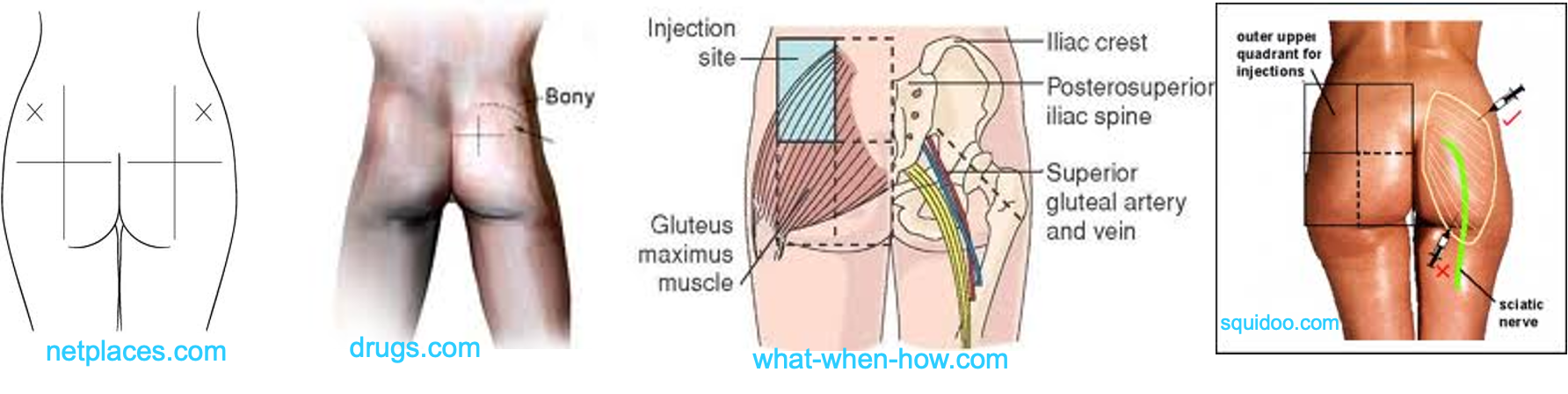 Buttocks, up to 5 mL may be given by IM injection although more than 3 ml can be painful