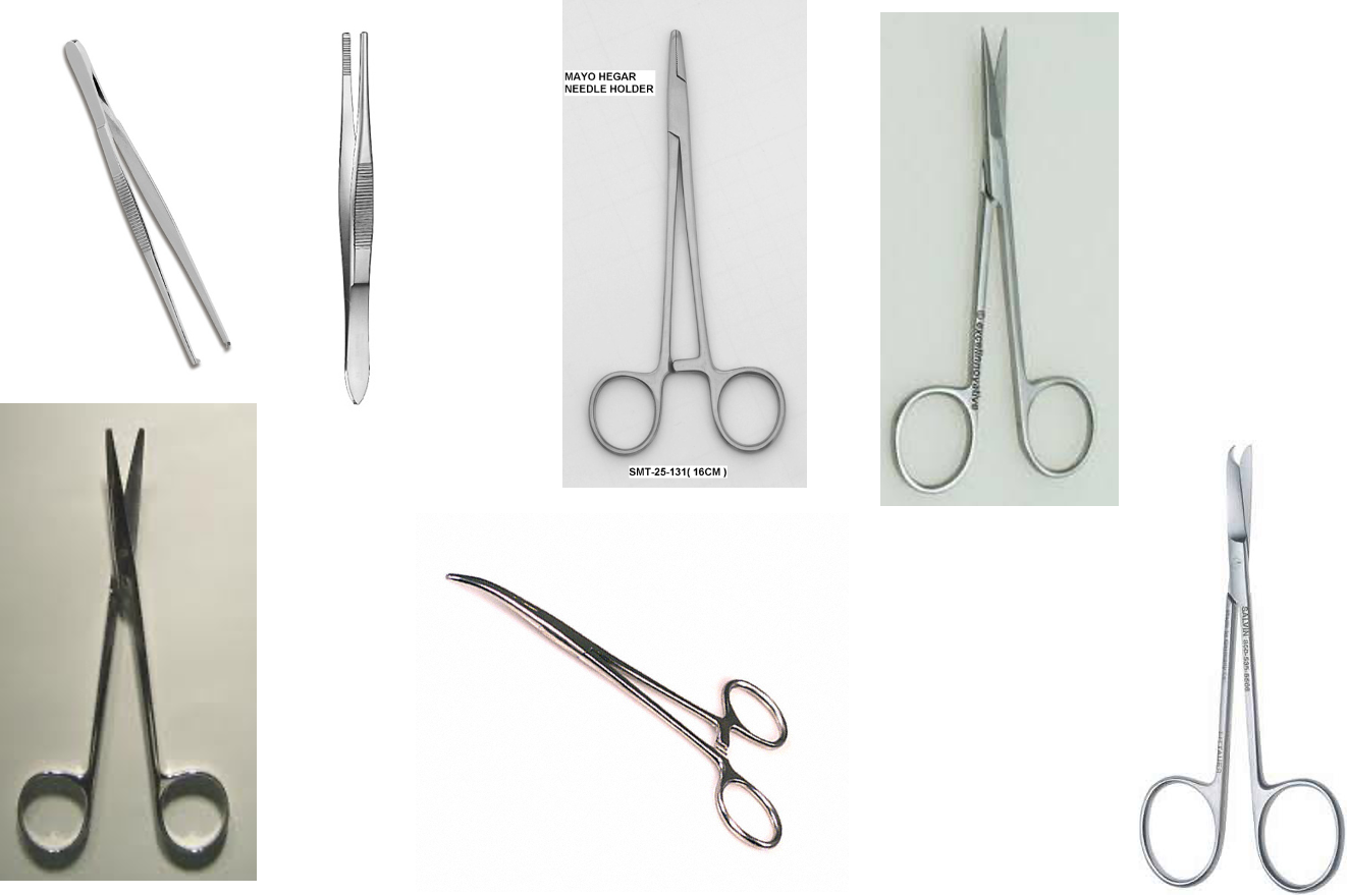 Tissue Forceps, Dressing Forceps, Needle Holder (Driver), Iris scissors (debridement/revision), Dissection Scissors (heavier tissue revision, wound undermining), Hemostats (clamping blood vessels, grasping,exploring), Suture Removal Scissors