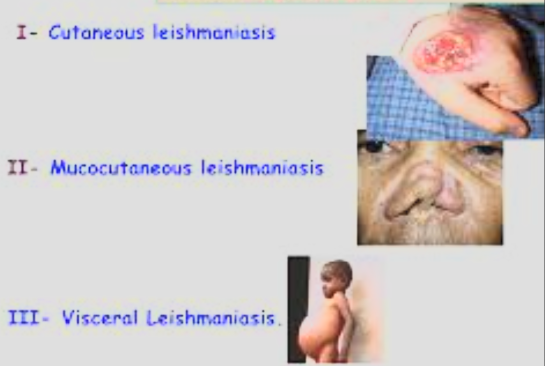 - Visceral: Fever, weight loss, enlarged spleen and liver, anemia.