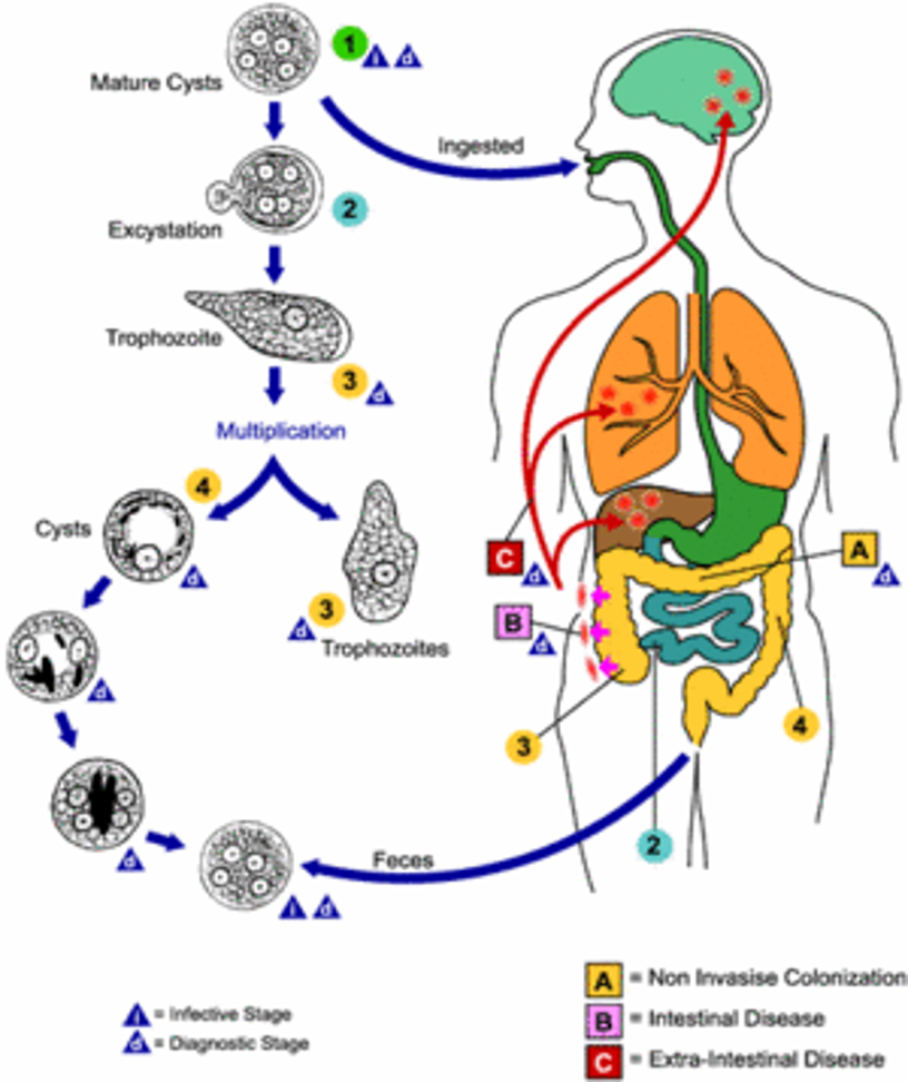Metronidazole Z and (tinidazole; expensive, single dose for 3 days) wide range of amoebiasis - dark urine, disulfaram