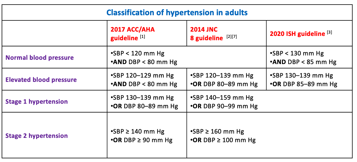 Hypertension in adults:  2020 International Society of Hypertension (ISH) and 2014 JNC 8: persistent SBP ≥ 140 mm Hg and/or DBP ≥ 90 mm Hg