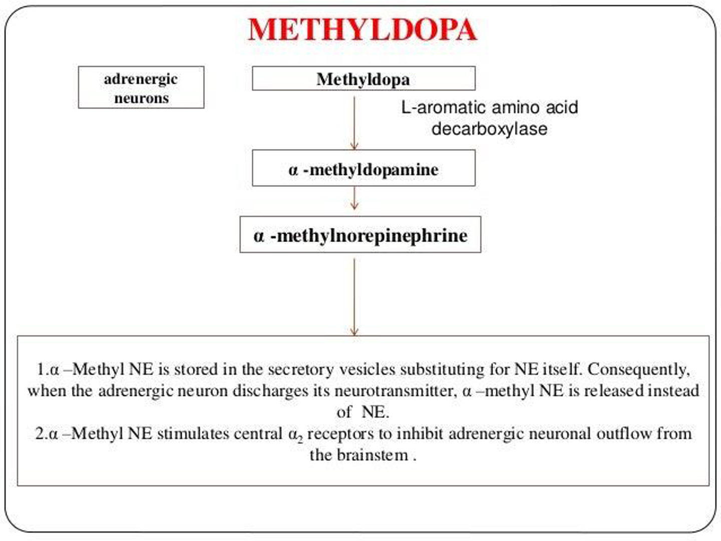 *Competes with dopa for dopa decarboxylase enzyme leading to formation of alpha methyl norepinephrine (false chemical transmitter) Which: