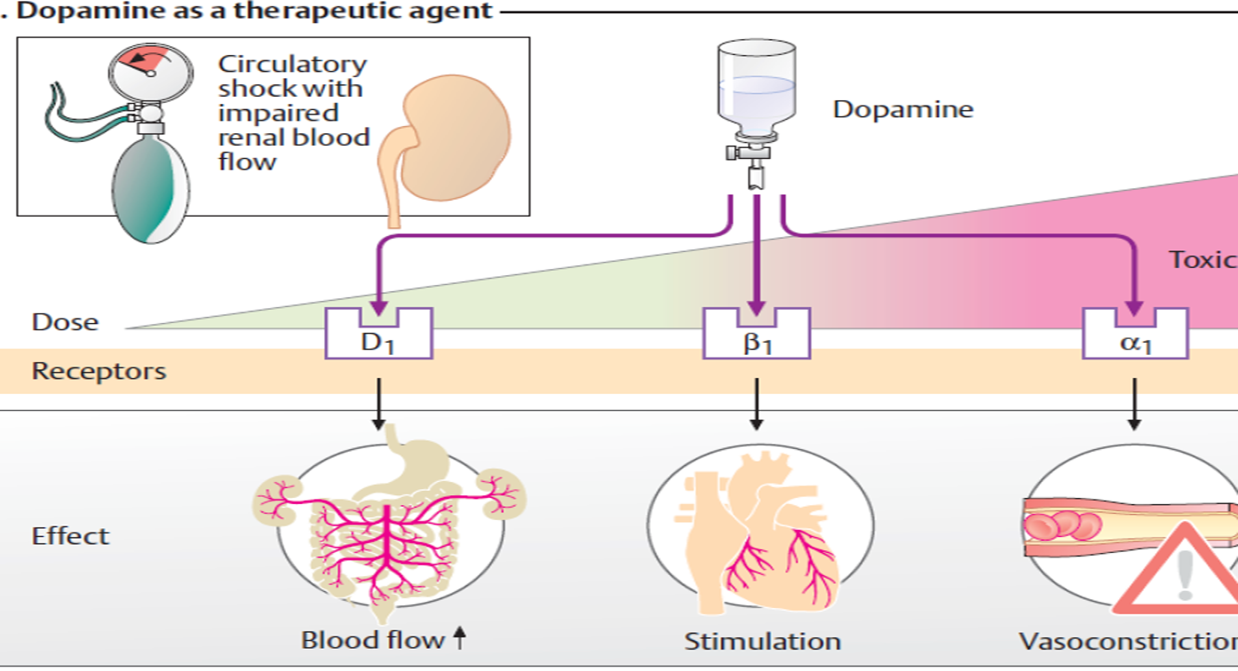 It is used for short term in some cases of refractory heart failure. In moderate doses, it increases myocardial contractility by stimulation of cardiac β1 receptors. In larger doses it can cause VC due to α1 stimulation. Dopamine is used in shock states.