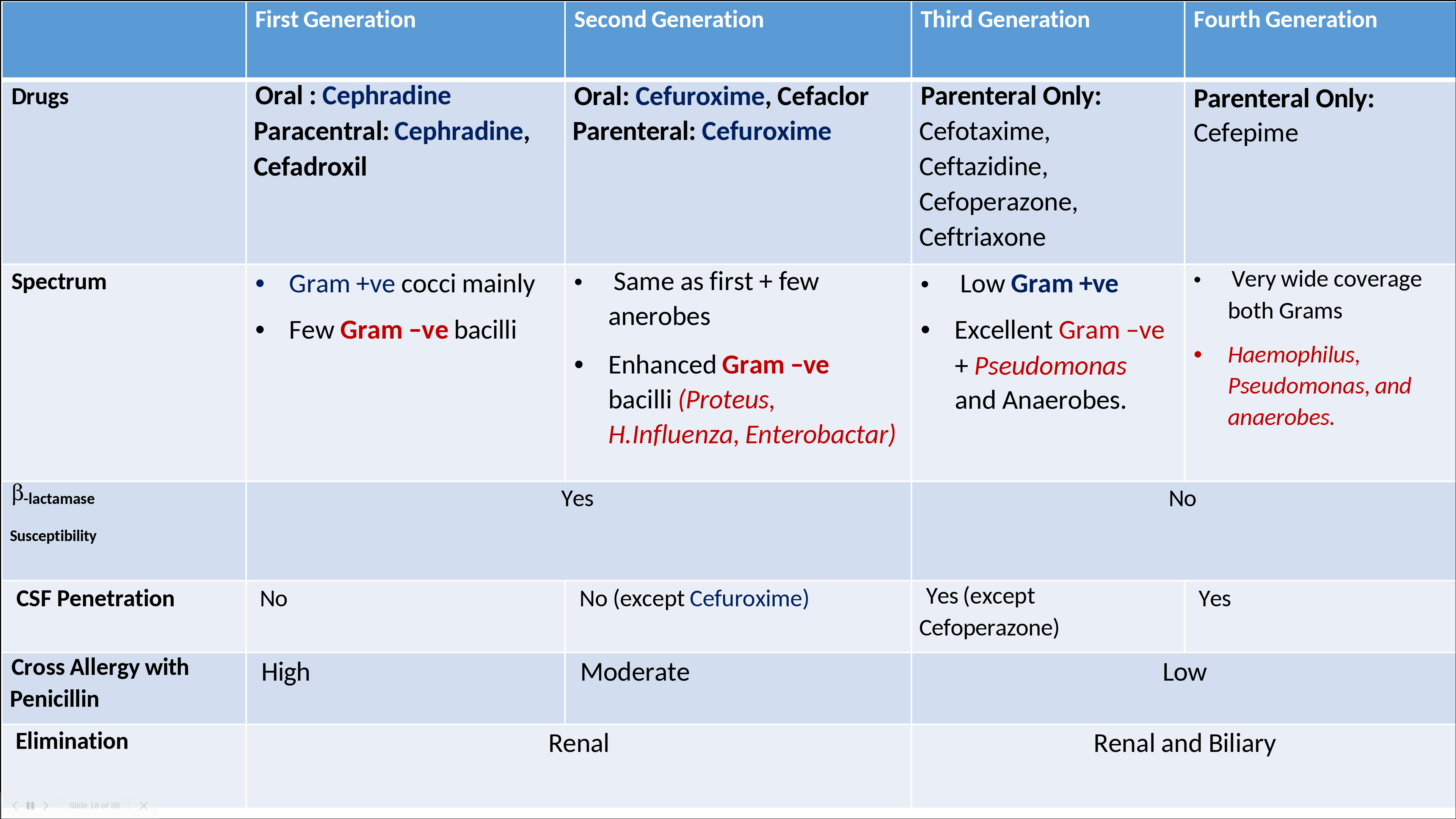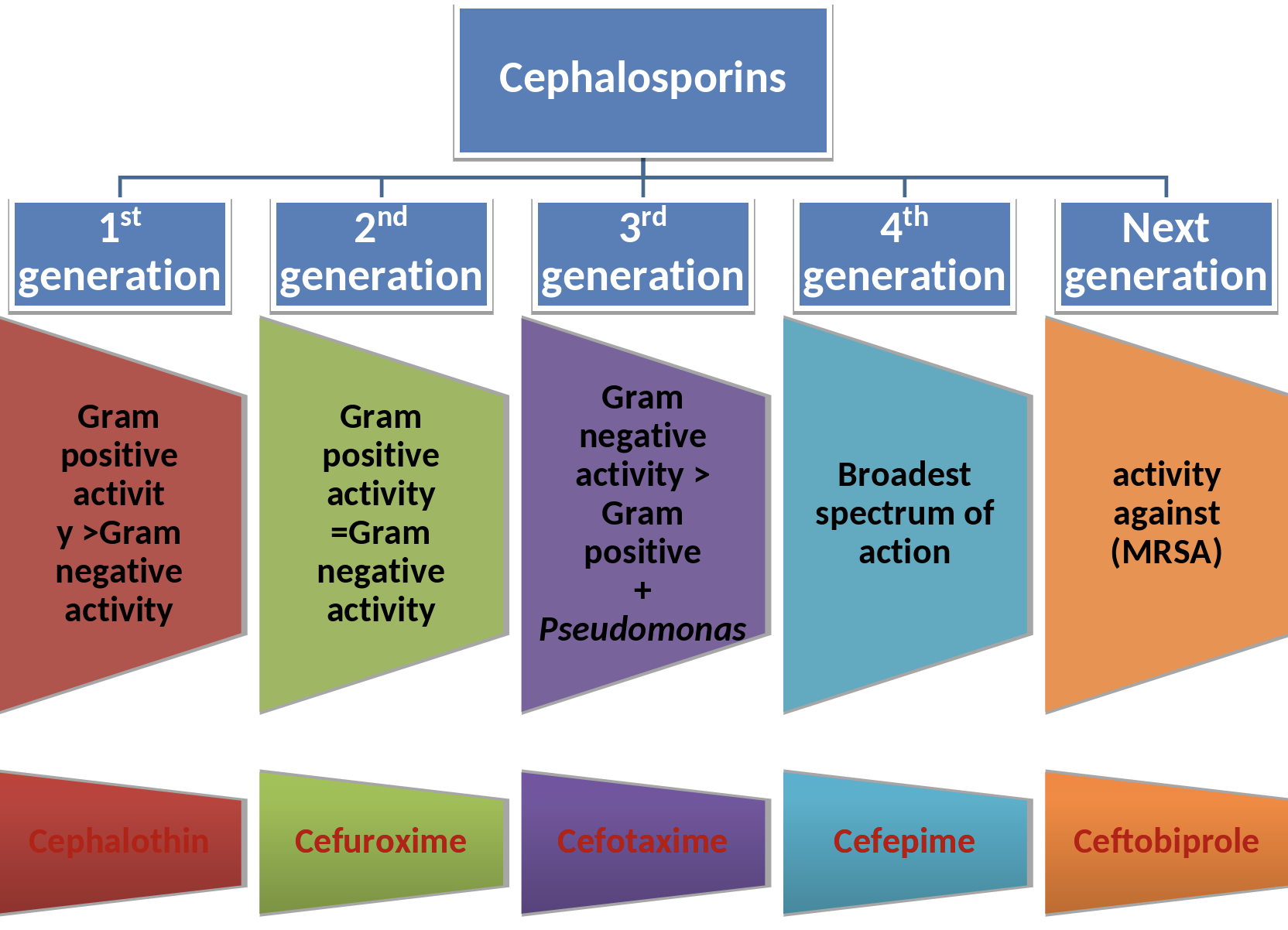 Antibacterial spectrum: They are divided into 1st (same as penicillin) , 2nd, 3rd (reverse of first + psuodomonas), and 4th (Anaerobic) generations. In general, the activity against gram-positive bacteria decreases from first to third generation while activity against gram-negative organisms increases.