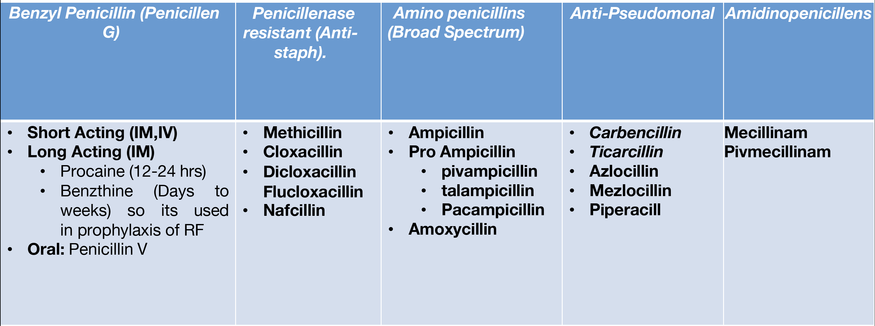 | (Penicillen_ G) | Penicillenase resistant (Anti-staph). | - Amino penicillins (Broad Spectrum) | - Anti-Pseudomonal | |