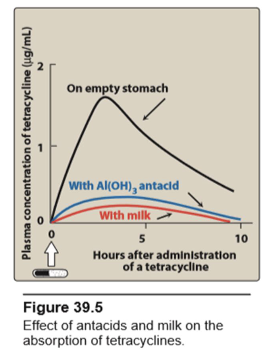 Calcium (milk and Ca. antacids), magnesium (Mg hydroxide), aluminum hydroxide and iron interfere with their absorption since they form insoluble chelates with tetracyclines.