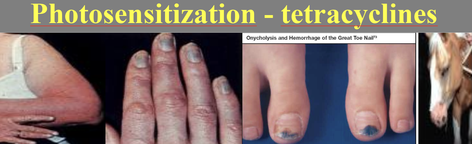 - Phototoxicity: Severe sunburn may occur in patients receiving a tetracycline who are exposed to sun or ultraviolet rays. This toxicity is encountered with any tetracycline, but more frequently with tetracycline and demeclocycline. Patients should be advised to wear adequate sun protection. Minocycline can sometimes lead to blue coloring of tissues.