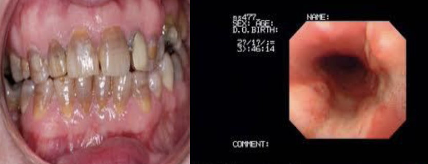 - e.g. sore throat, sore tongue, black hairy tongue, perioral soreness. The cause is decreased synthesis of Vit. B12 and mild superinfection.