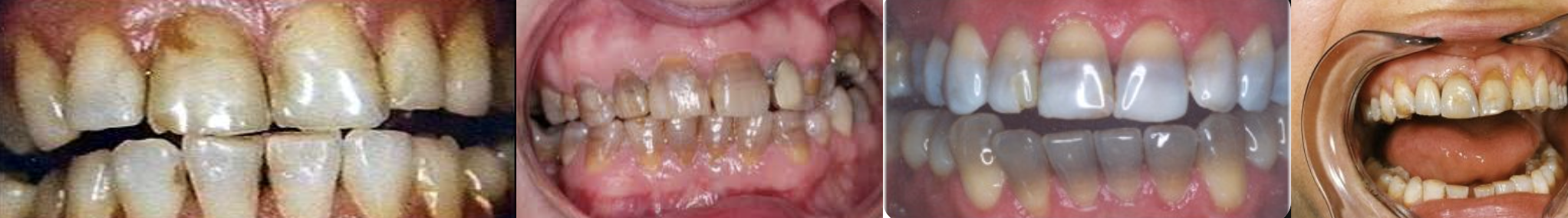 Yellow staining of both the deciduous and permanent teeth: and dental enamel hypoplasia (increased susceptibility to caries, as well as retardation of bone growth) because of their chelating properties with calcium.This can occur if tetracyclines are administered after the fourth month of gestation or if they are given to children less than 8 years of age, this is a further reason for avoiding their use during pregnancy. Doxycycline is less likely to cause tooth discoloration
