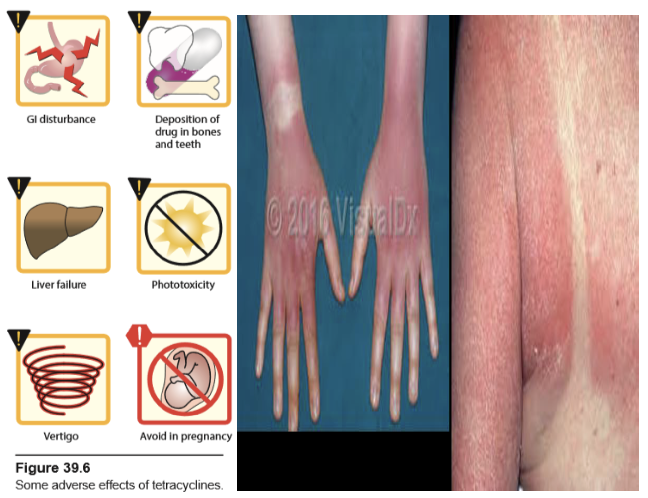 B) Distribution Least lipid soluble, can be used for eye infection, and CSF such as (minocyclins & doxycyclins) - Can cause bone, growth, tooth, discoloration deformations. espicially in pregnancy and children under age of 8 - Tetracyclines are distributed throughout body tissues and fluids. - Doxycycline is the most lipid-soluble, while oxytetracycline is the least lipid soluble. - All concentrate well in the bile, liver, kidney, gingival fluid, and skin. - All, bind to tissues undergoing calcification (for example, teeth and bones) or to tumors that have a high calcium content. All tetracyclines cross the placental barrier and because of their chelating properties with calcium they tend to be deposited in growing bones and teeth causing yellow discoloration. - Only minocycline and doxycycline achieve therapeutic levels in the cerebrospinal fluid (CSF). - Minocycline also achieves high levels in saliva and tears, rendering it useful in eradicating the meningococcal carrier state.
