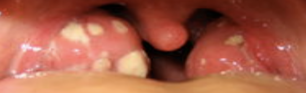 - Red pharynx, enlarged tonsils and classically covered with a yellow, blood-tinged exudate.