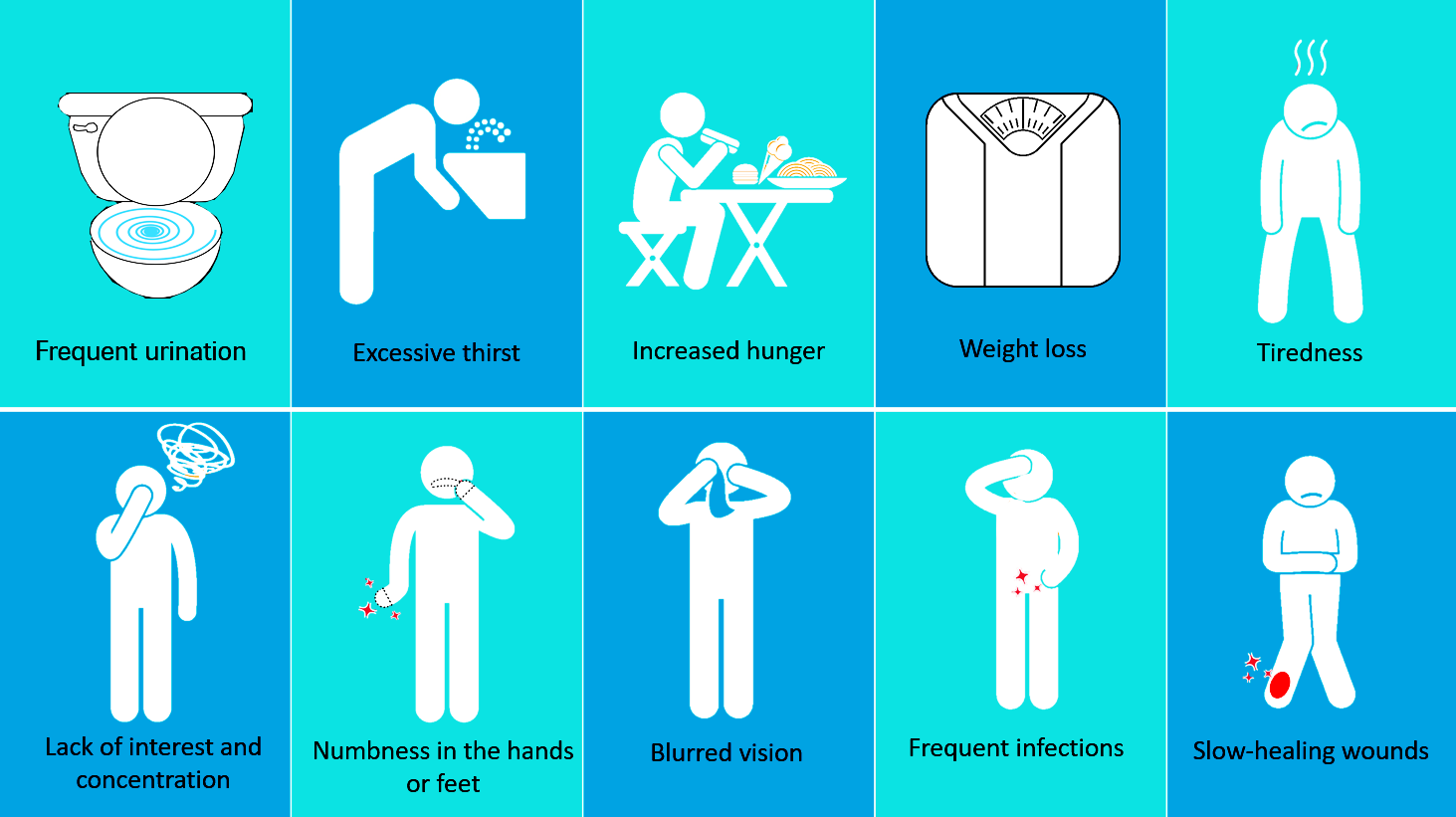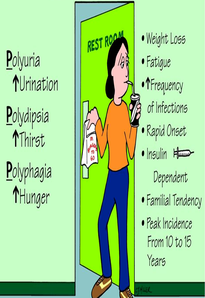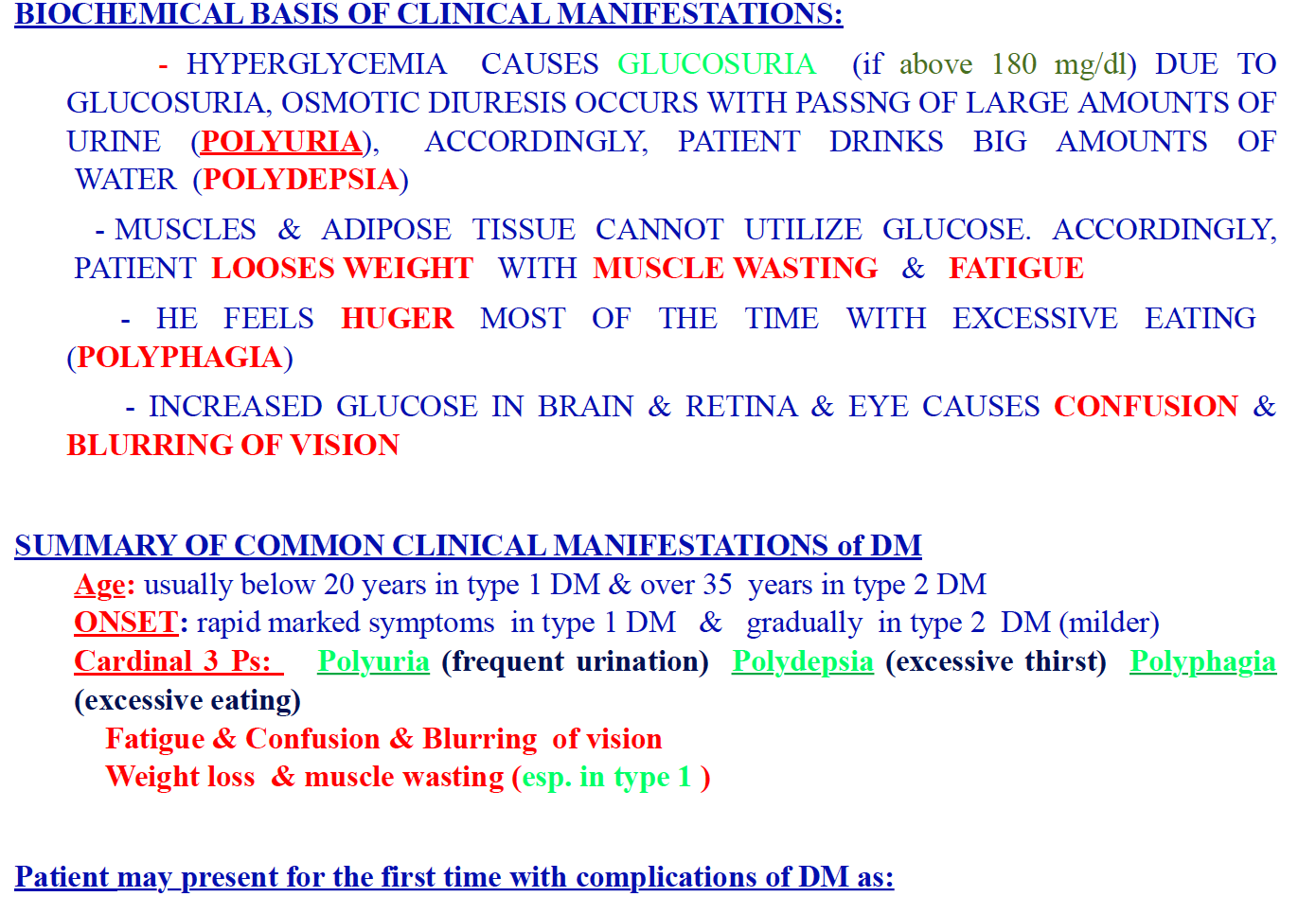 - INCREASED GLUCOSE IN BRAIN & RETINA & EYE CAUSES CONFUSION & BLURRING OF VISION SUMMARY OF COMMON CLINICAL MANIFESTATIONS of DM Age: usually below 20 years in type 1 DM & over 35 years in type 2 DM ONSET: rapid marked symptoms in type 1 DM & gradually in type 2 DM (milder) Cardinal 3 Ps: Polyuria (frequent urination) Polydepsia (excessive thirst) Polyphagia (excessive eating) Fatigue & Confusion & Blurring of vision Weight loss & muscle wasting (esp. in type 1 ) Patient may present for the first time with complications of DM as: