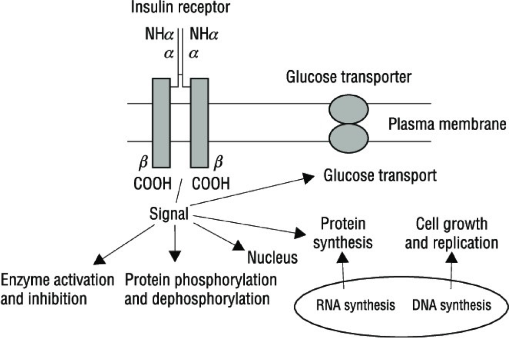 IR, a tyrosine kinase, consists of α and β chains and is activatedby insulin-like growth factors I and II and insulin. There are two IR isoforms, A and B, but the B isoform is the primary isoform and is more specific for insulin.