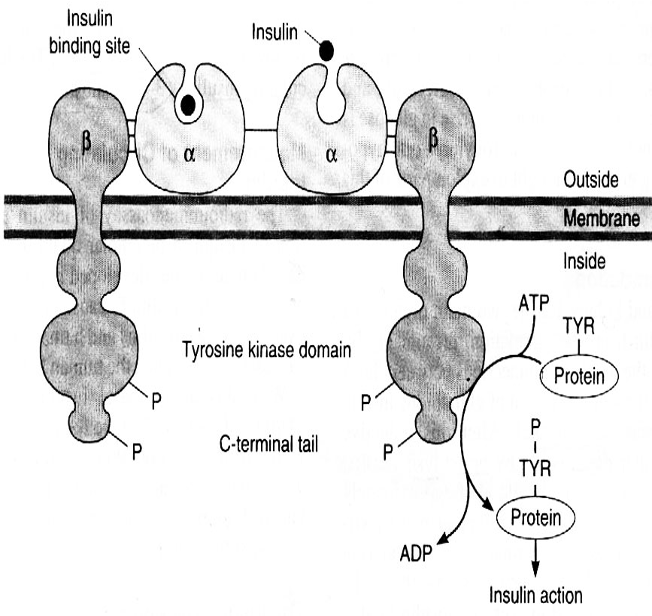 Insulin receptors: Structure: 2 extra-cellular α-subunits & 2 trans-membrane β-subunits.