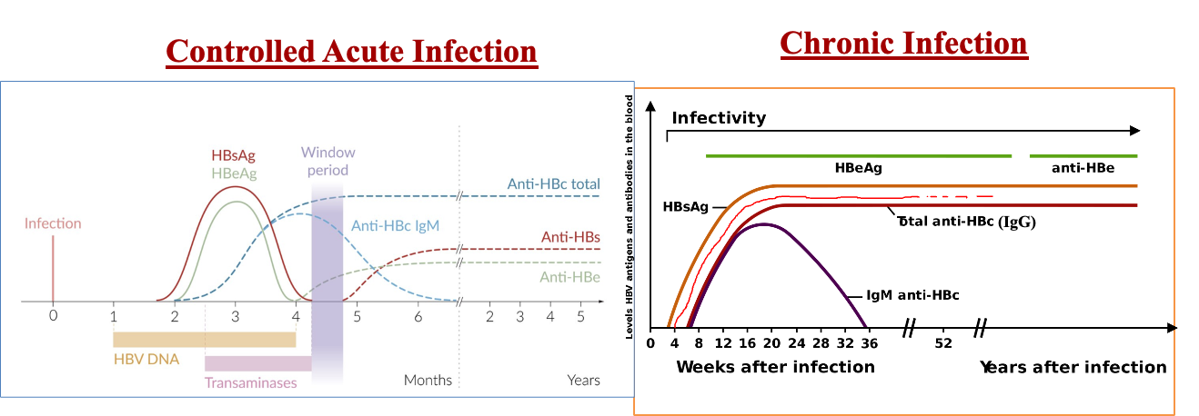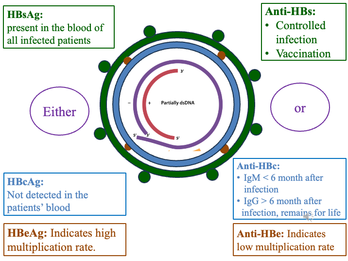 - Window Period: Time period when infection has just resolved. “s” antigen has disappeared, but Anti-HBs antibody is still undetectable. Only Anti-HBc IgM type is positive.