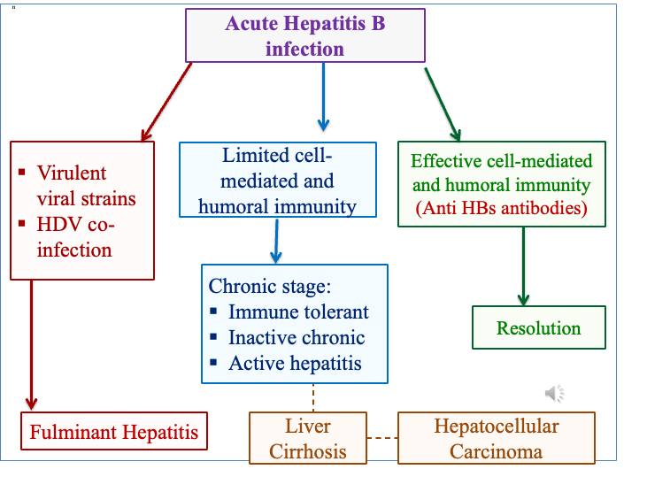 - Failing immune clearance→ viral persistence→ persistent inflammation → necrosis and regeneration processes → cirrhosis→ hepatocellular carcinoma (HCC).