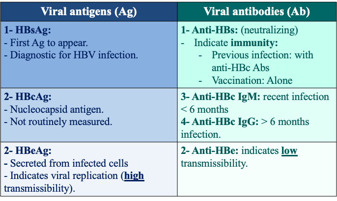 - Hep B Serology: Antigens and antibodies.