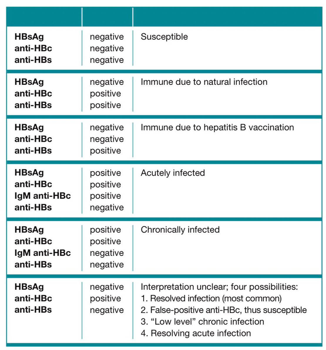 | HBsAg (Active Infection) | Anti=HBc IgM (Window Peroid) | Anti-HBc IgG (Chronic/Treatment) | Anti-HBs (Resolved/Vaccinated) | Diagnosis |