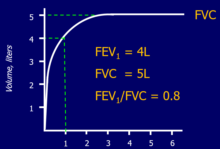 - FEV1/FVC ratio : 4/5 = 75% to 80%