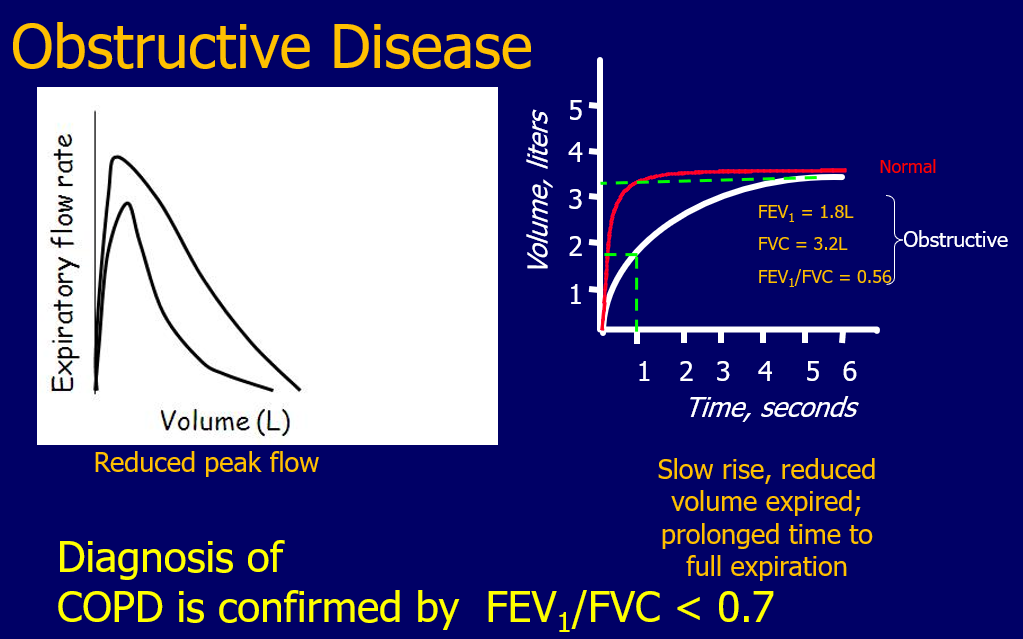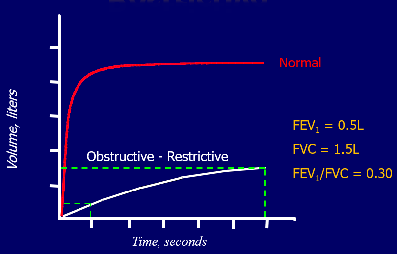 - **eg FEV1= 1.3L, FVC = 3.2L, ratio