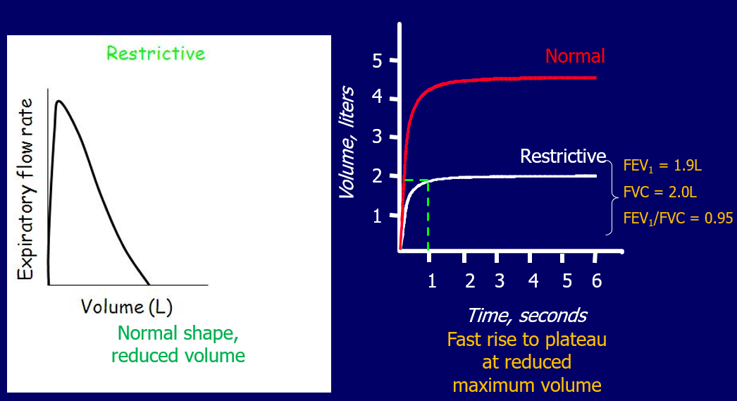 Examples of restrictive diseass are abnormalities of the spine and chest and diseases within the lungs that make them less elastic (“stiffer”), such as pulmonary fibrosis.