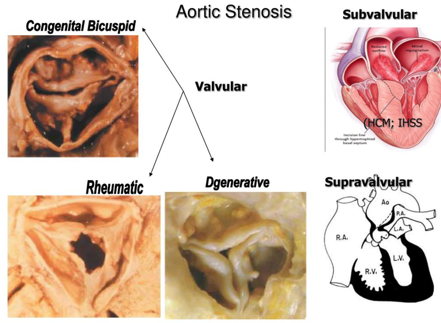 Narrowed opening area of the aortic valve during systole → obstruction of blood flow from the left ventricle (LV) → increased LV pressure → left ventricular concentric hypertrophy, which leads to: Increased LV oxygen demand. Impaired ventricular filling during diastole → left heart failure. Reduced coronary flow reserve. Initially, cardiac output (CO) can be maintained. Later, the decreased distensibility of the left ventricle reduces cardiac output and may then cause backflow into the pulmonary veins and capillaries → higher afterload (pulmonic pressure) on the right heart → right heart failure.