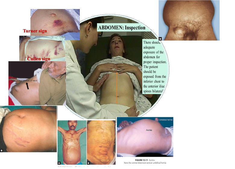 Abdomen: Venous distention, Ascites, hernias; cough, umbilicus, cullens & grey turner; Pancreatitis