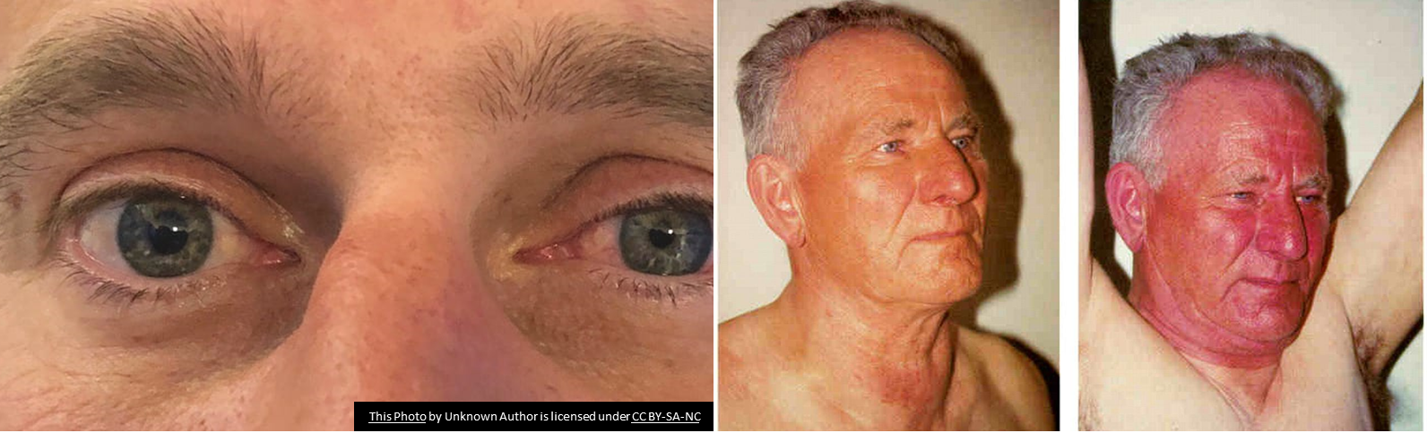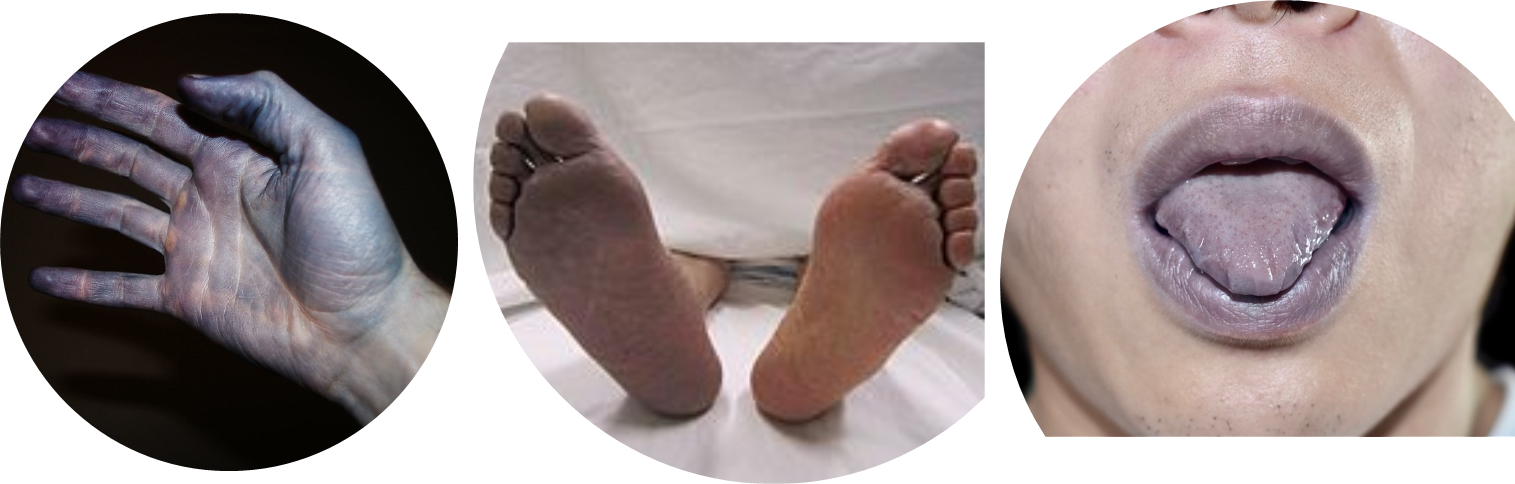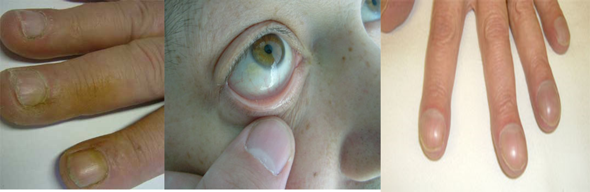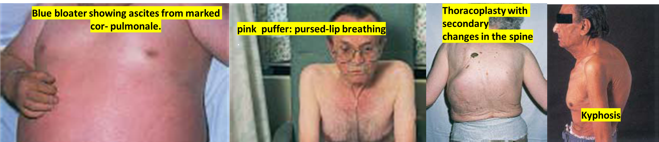- General appearance - eg, Cushingoid as a result of long-term use of steroids. - Tongue: central cyanosis - Anaemia (conjunctivae). - Eye: Horner’s syndrome (possible apical lung cancer). in CA bronchus