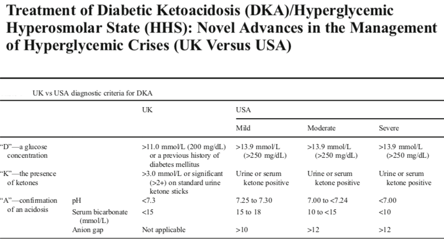 First, there are small differences in the diagnostic criteria for DKA. The threshold level of glucose required for diagnosis in the UK is 200 mg/dL, whereas it is 250 mg/dL or above in the American guideline.